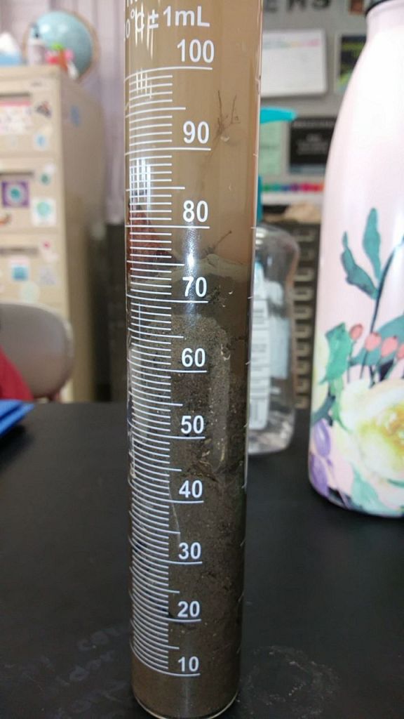 After placing our soil sample in a 100mL graduated cylinder mixed with water for about 24 hours we came to the conclusion that the type of soil we have is sand. We measured the height of each layer and the total height of the sample and obtained a 91% of sand, 4.5% of silt, and 4.5% of clay. This method compares to the qualitative method by helping us evenly divide the types of soils we have in our sample, which differentiates to other samples. Many of the soil texture results of other groups indicated that their samples were mainly silt loam. Many of the areas that had outside impacts such as salt used during the winter months landing on the grass and going into the soil. Also the use of pesticides were major areas in which loam was mainly found. We believe that the soils are the way that they are due to outside factors such as human impacts that may have changed the formations of the soil. Grass was the only plant growing naturally in the area where we took our samples from. Yes, plants prefer soil that has more sandy loam because loam has an even mixture of sand, silt, and clay.