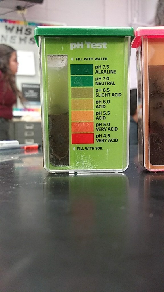 Based on our results of the tests we did to our soil sample we have come to the conclusion that our soil lacks nitrogen and has a stable amount of the nutrients, phosphorus, and potassium. The ideal pH range for the growth of plants falls between 5.5 and 7.0. Many plants are able to adapt to pH levels outside this range. The pH level for our sample falls between 6.5 and 7, indicating that the levels are just right for the growth of plants. The only plants growing in our sample was grass but there were also worms within the soil meaning that if there are enough nutrients for other organisms to grow then there are enough nutrients for other plants to grow and stay healthy. The grass is growing relatively healthy but there are no other plants there because the only outside factors impacting the growth of the soil is the cutting of it. Other plants are not being planted for the purpose of not affecting the soil. There are no pesticides being used to affect the growth of the plants.